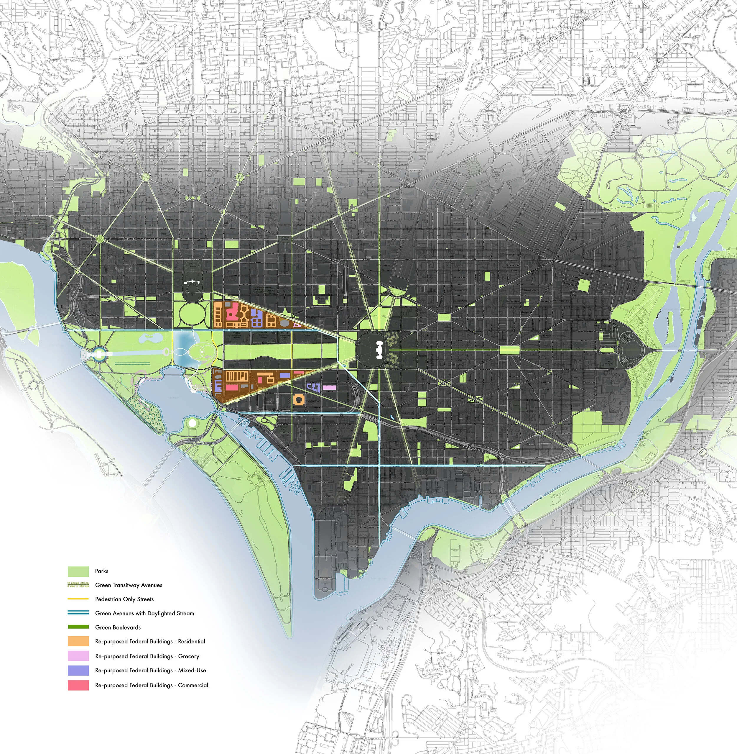 A team of students and practitioners developed case studies for various areas on the National Mall - together they frame a vision that is resilient and sustainable, equitable and inclusive. Blue Green streets daylight stormwater and incorporate green space with multimodal transportation boulevards that increase biodiversity and celebrate water. Green Living provides affordable housing, food access, and community gardens in the city’s monumental core by repurposing existing federal buildings. Living Memorials imagine a place where recreation, natural habitat, and infrastructure meet. Empowered Edges are made up of living shorelines and new landscapes that adapt to and mitigate flooding while regenerating ecosystems.