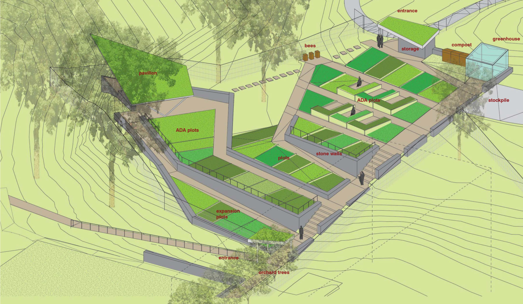 The team ran solar models to determine optimal layout for the majority of the plots. A stair climbs the hillside and connects to sections of the path as it winds from terrace to terrace. Pavilions and gates anchor the three corners and provide meeting space and security at the entrances. Areas along the path were designed to accommodate bee-keeping, compost piles, and a greenhouse. Wooden raised garden beds are designed to be accessible to all.